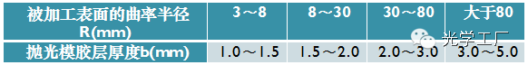 抛光模层表面的曲率半径以Rp表示,它等于透镜完工后的曲率半径R,但符号相反。抛光模基体的曲率半径以Rt表示,可按下式计算: